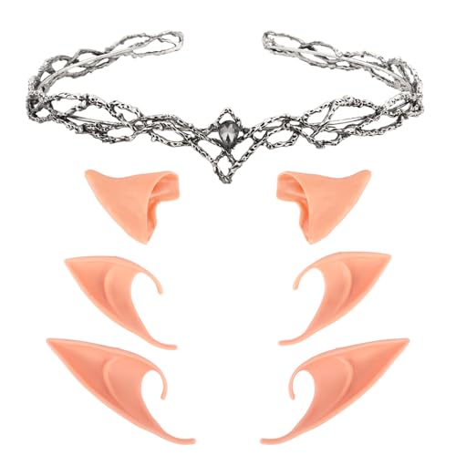 WHAVEL Elf Crown with Fairy Ears - Fairy Headpiece with 3 Pairs Soft Elf Ears Cuffs Cosplay Reneaissance (Silver, Black crystal)
