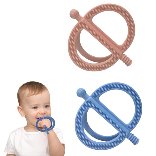 SOLIFEGOBLE 2 Pack Baby Teething Toy for 0-24 Months, Food Grade Silicone Teether, Easy Grip Design to Soothe Gum Pain, BPA-Free, Freezable & Dishwasher Safe (Khaki+Light Blue)